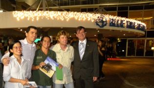 Grace Downey recebe das mãos de Christiane Kokubo, do marketing da rede hoteleira apoiadora do projeto, a carta de boas-vindas de Chieko Aoki, presidente da Blue Tree Hotels
